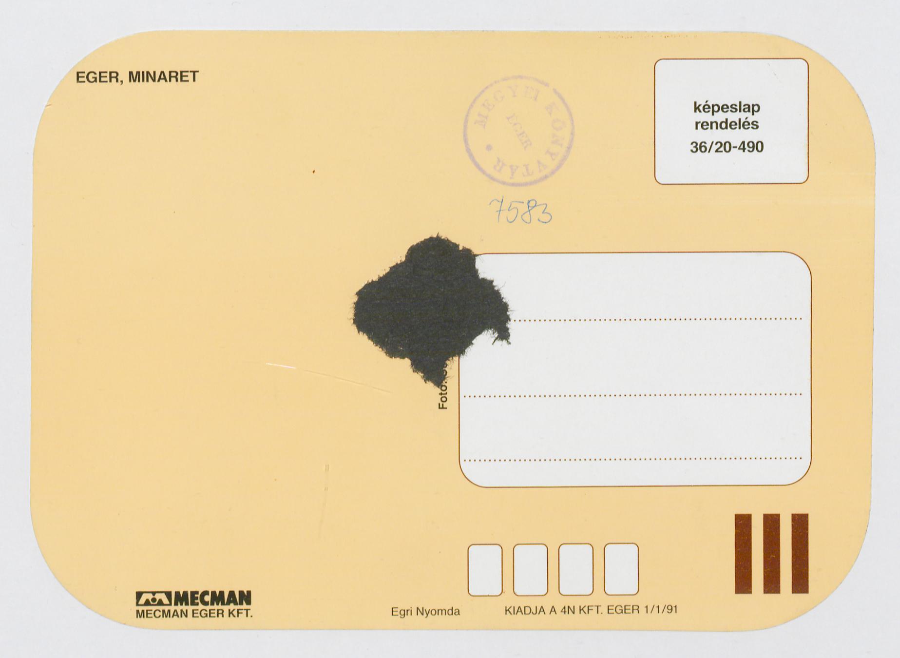 Eger város címerével, a képeslap sarkai legombolyítve