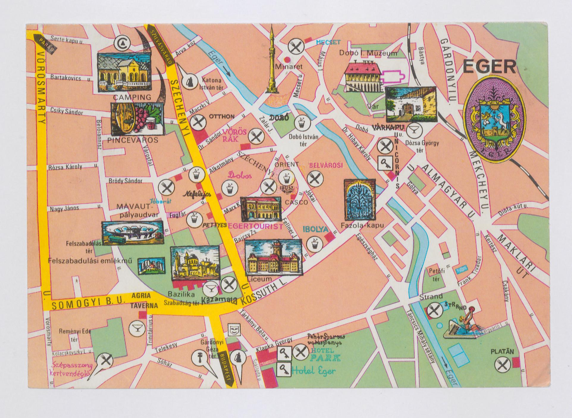 A képeslapon a belváros térképe található