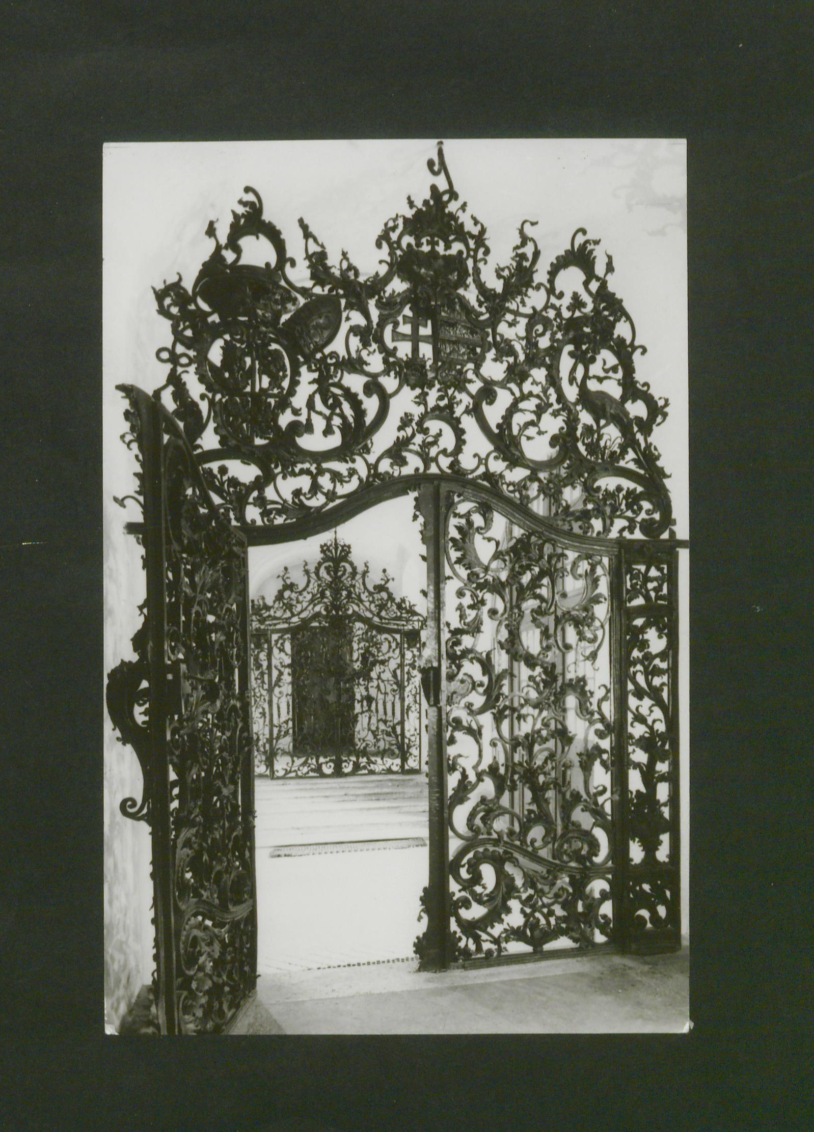 A Kossuth Lajos utca 9. sz. alatt álló Megyeháza épületét díszíti. Fazola Henrik (Würzburg, 1730 - Diósgyőr, 1779) vasműves munkája, akit Barkóczy Ferenc egri püspök hívott Egerbe. A két kapu a rokokó művészet legszebb művei közé tartozik, 1758-1761 között készült. A címeres kapu a jobb oldalon, eredeti helyén áll. A baloldali szőlőfürtös kapu eredetileg a második emeleten, az ülésterem és a lépcsőház között állt. A címeres kapun három címer látható, az első az építtető, Barkóczy Ferencé, a középső az ország, a harmadik pedig Eger címere. A szemközti kapu a szőlőfürtjein, vesszőin, indáin kívül más növényábrázolásokkal is gazdagon díszített. A címeres kapu külön érdekessége a kilincs, ami egy bohócot ábrázol. A főkapu feletti félköríves betétrács díszítés is Fazola Henrik munkája. A díszrácson három aranyozott szobor áll: a Hit, a Remény és az Igazság allegóriái.